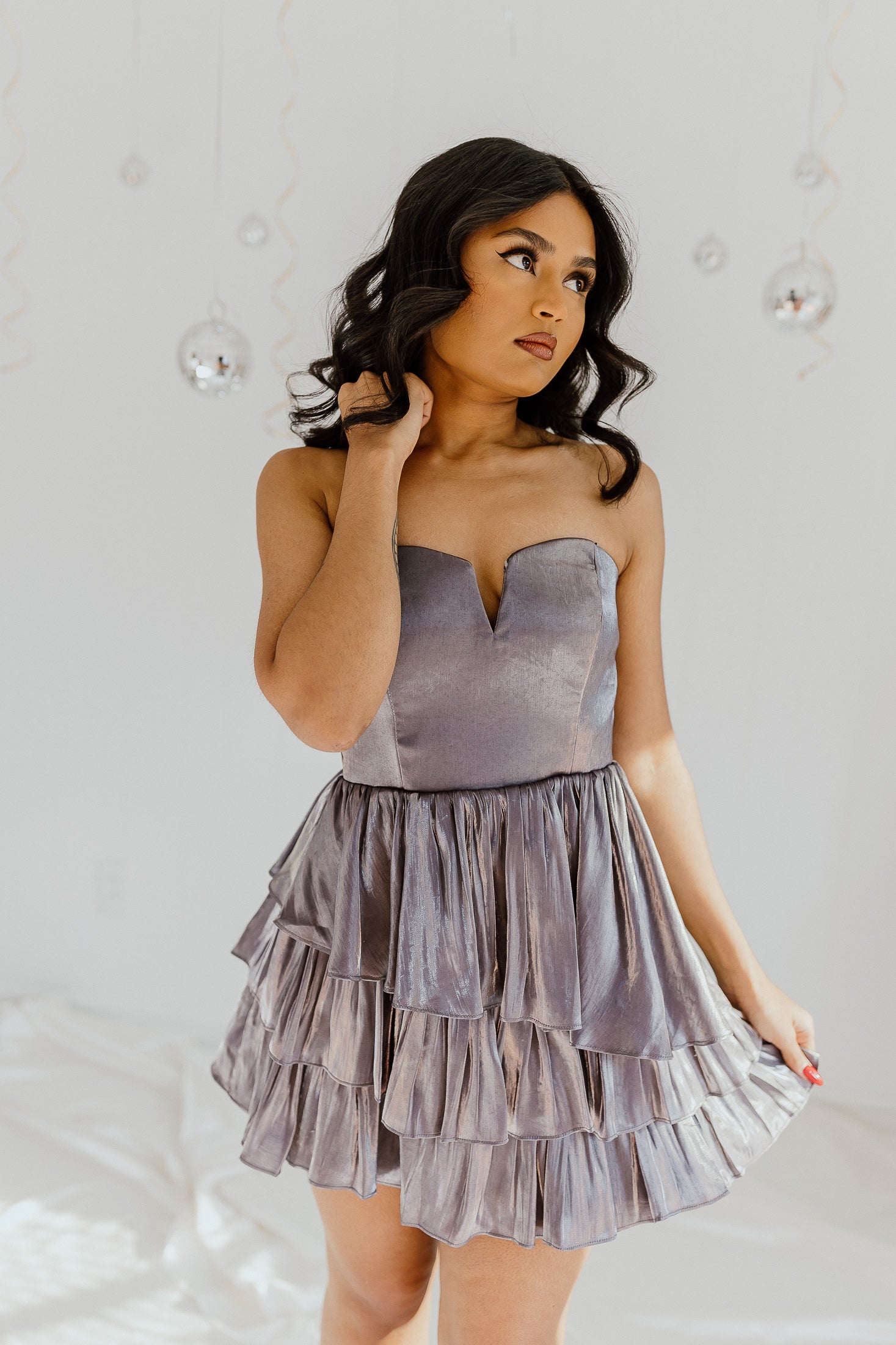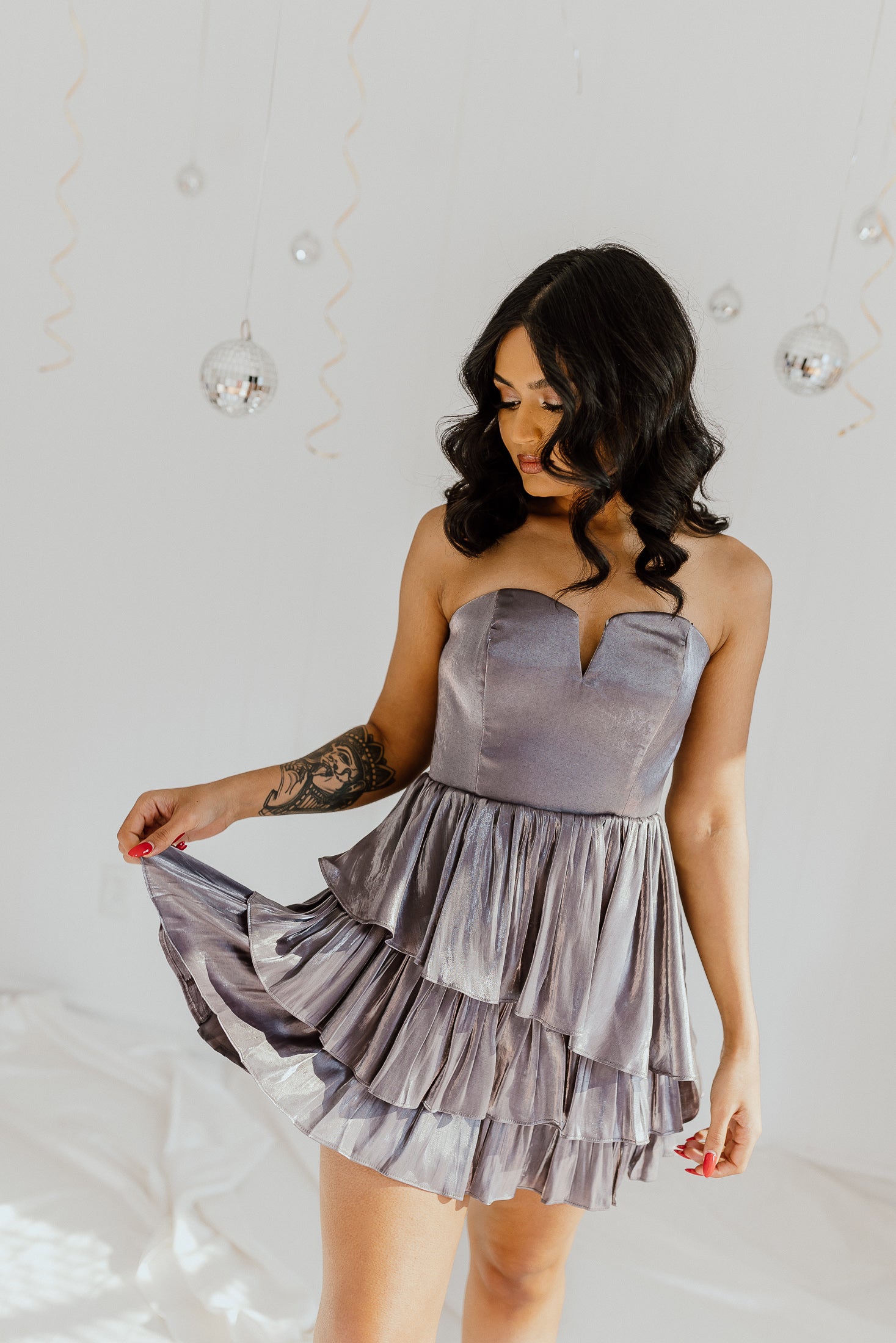 "Blow A Kiss" Ruffle Mini Dress - Gunmetal