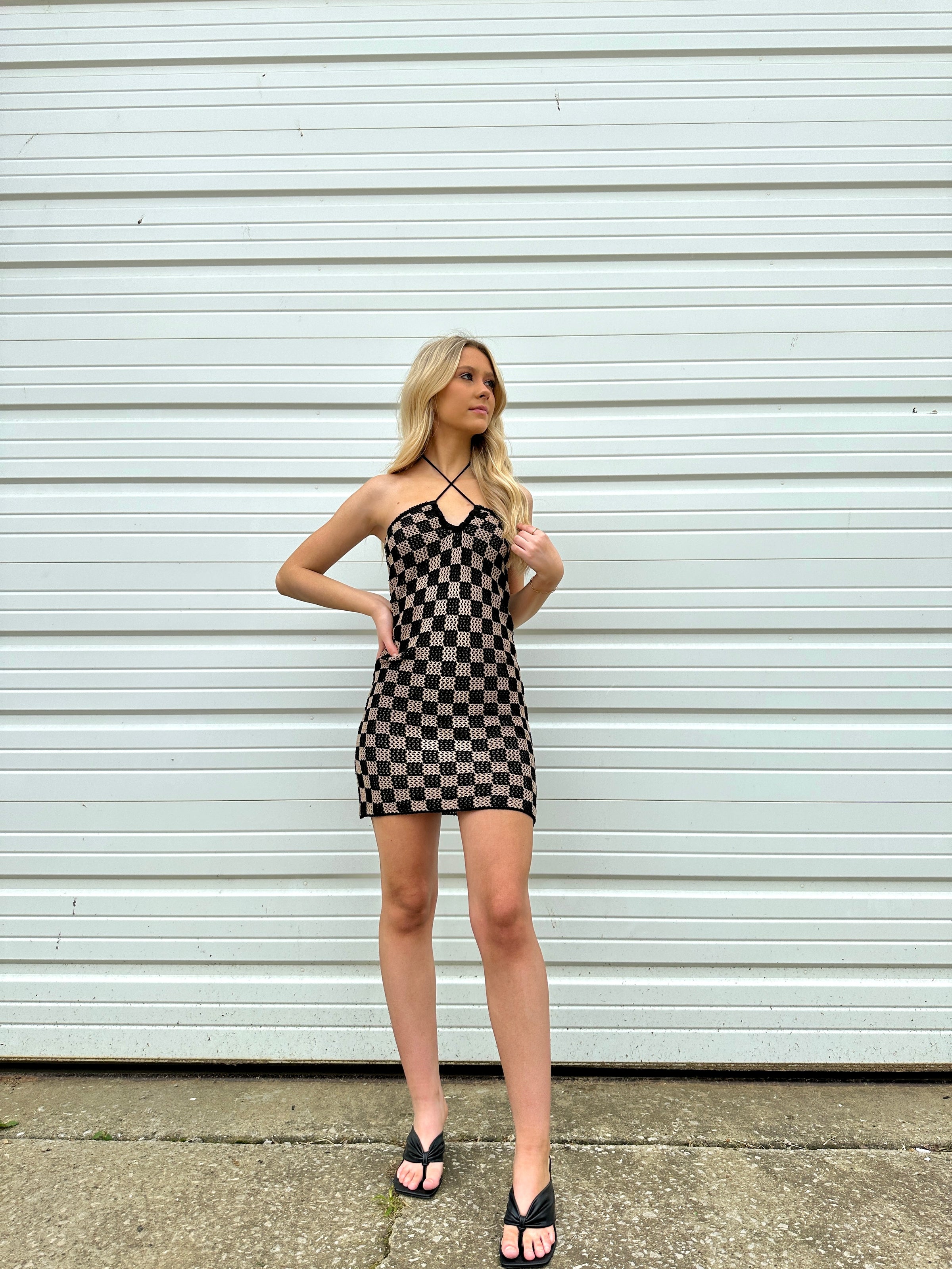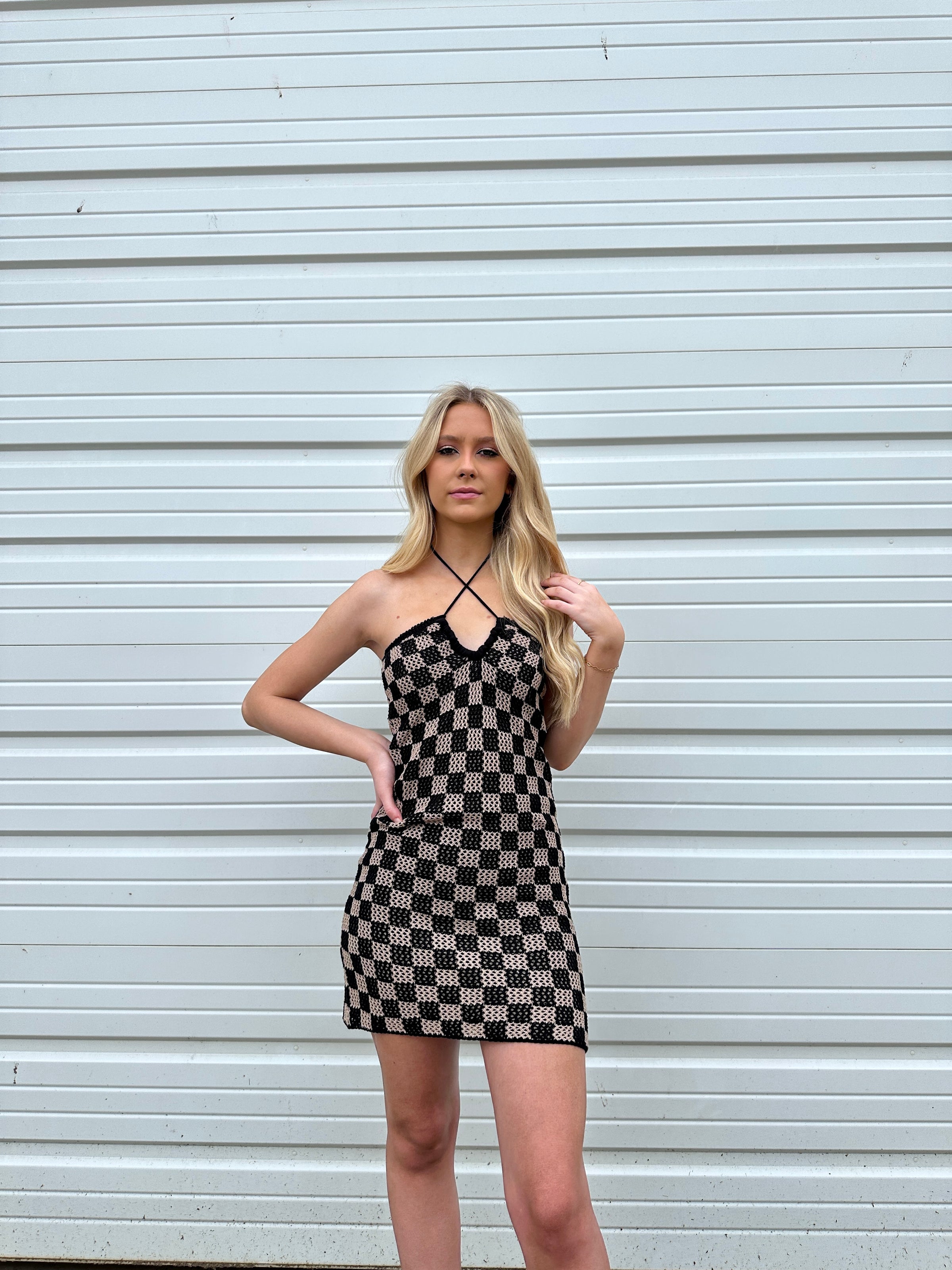 "Breaking Me" Halter Checkered Mini Dress - Tan/Black