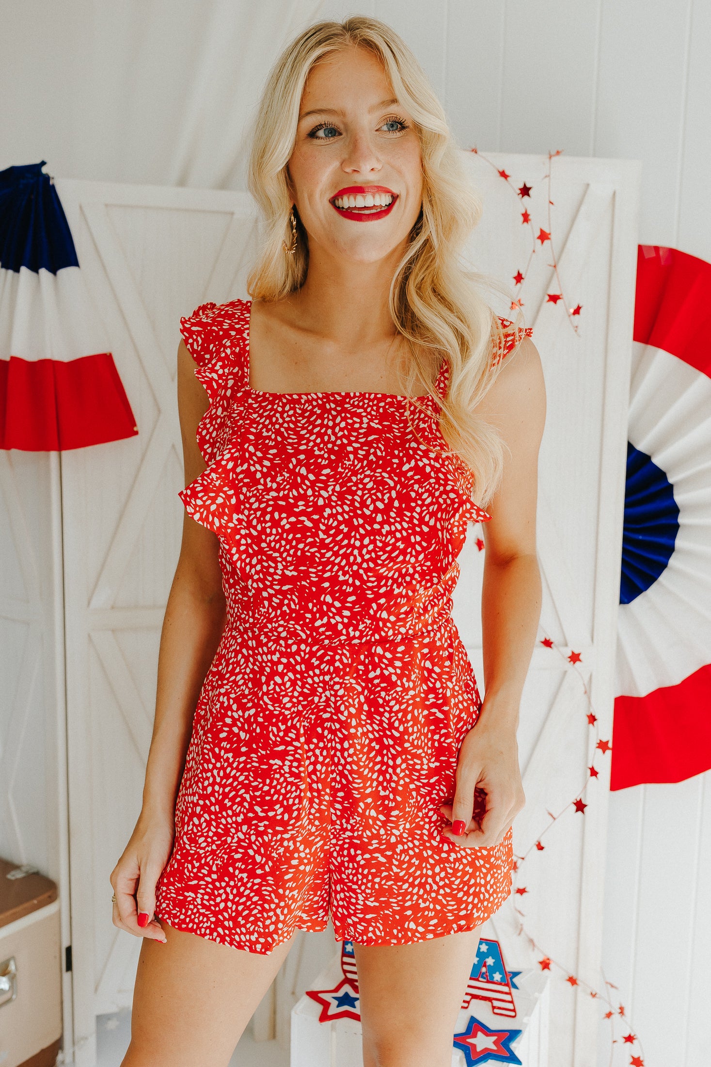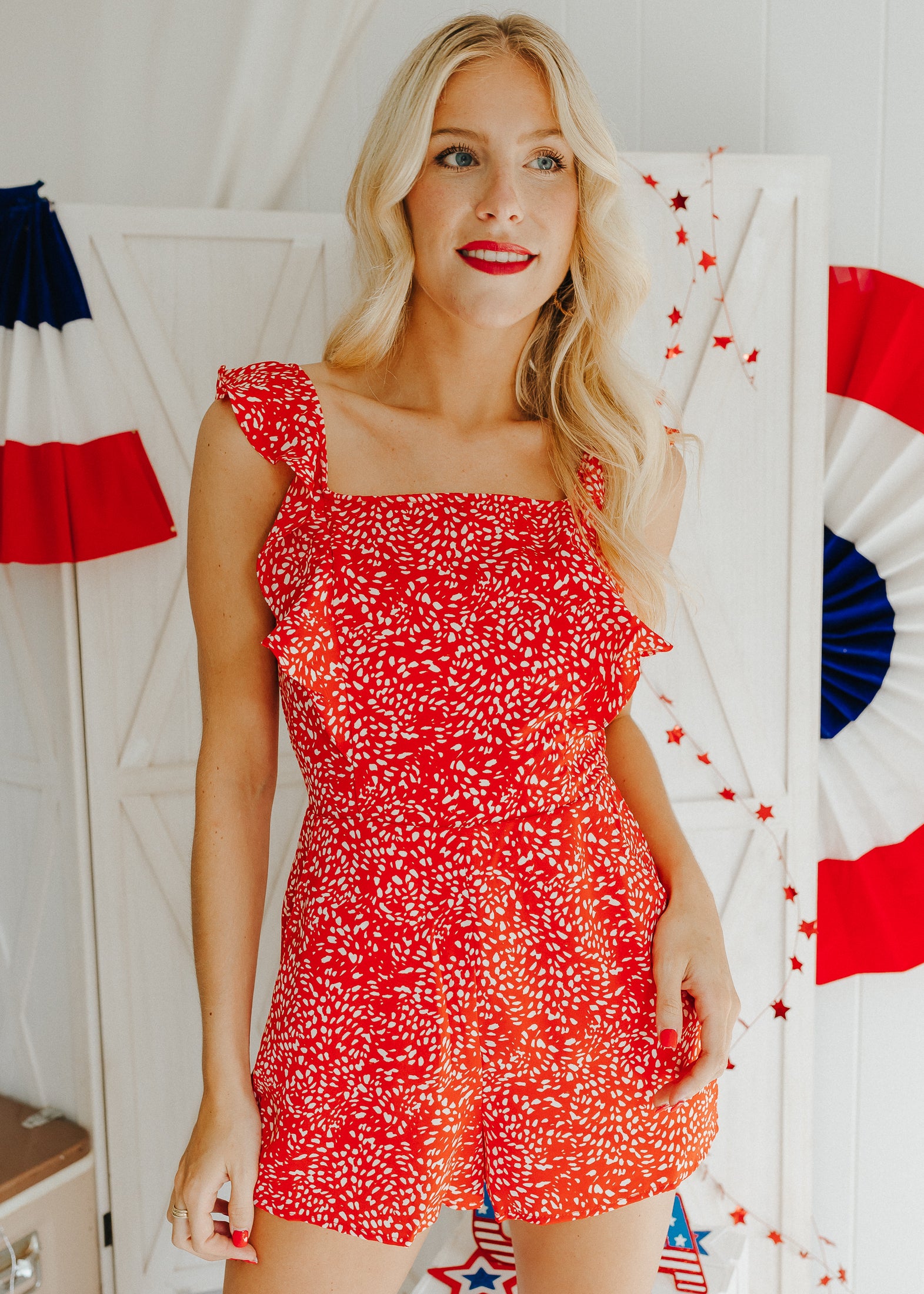 "Feel This Magic" Printed Ruffle Sleeve Romper - Red